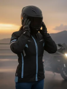 Fabricada en resistente cordura, cuenta con protecciones en codos, hombros y espalda, y ventilaciones estratégicas para mantenerte cómodo incluso en rutas largas.
